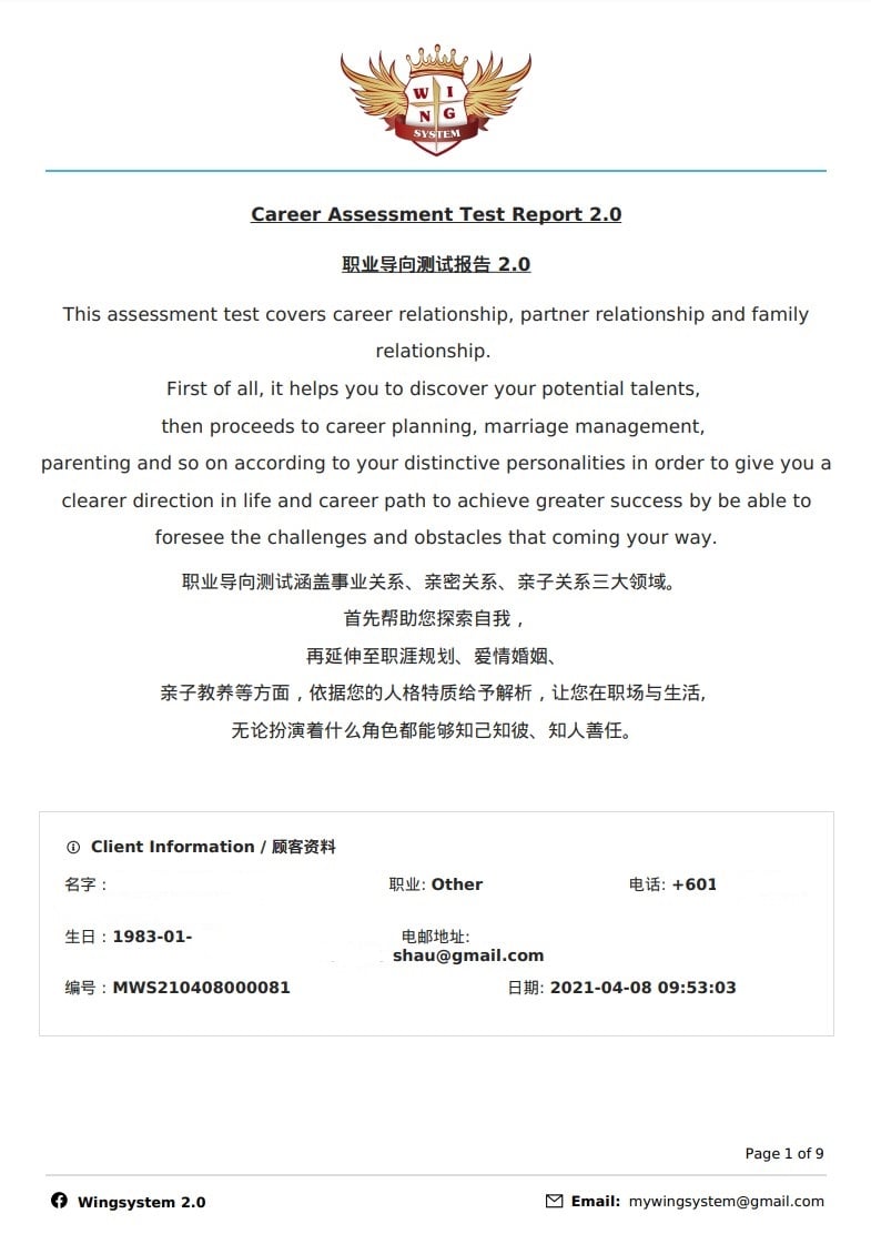 This assessment test covers career relationship, partner relationship and family relationship. First, it helps you to discover your potential talents, then proceeds to career planning, marriage management, parenting and so on according to your distinctive personalities in order to give you a clearer direction in life and career path to achieve greater success by be able to foresee the challenges and obstacles that coming your way.
